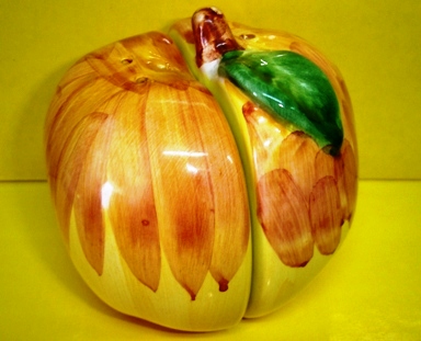Gosto da maça :) Que colecção engraçada! Lembrei que também eu comprei um saleiro/pimenteiro no OLX por lhe achar de grande beleza. Era de louça verde-esmeralda, consistia em dois peixes num suporte de algas e troncos. Mas quem fez a transacção comigo não foi leal e omitiu que as barbatanas estavam partidas. Ainda assim guardei a peça. Gosto dela, mesmo com pontas partidas. Agora que vi isto pensei: Olha, uma pessoa que era capaz de apreciar aquele objecto mais do que eu! Será que aceita saleiros danificados? Se gostar envio-lhe de graça. Mas agora fui ver no móvel para me certificar do estado e não dei com ele. Percebi então o seu destino: o caixote de lixo. Não pelas minhas mãos, cá está...